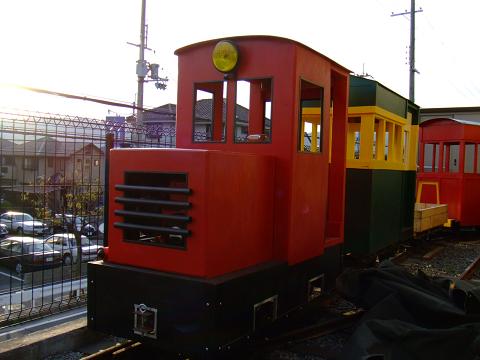 機関車 明野軽便鉄道の主動力です。 ガソリン発電機で電気を起し交流モーターを動かします。 ▲ 機関車の外観です。 ▲ 機関車の運転台です。 左からベル・マスコン・逆転機・ブレーキ ▲ 上部左には機関車と客車についているボタンを押すとベルが鳴る また上部右には成田山不動尊のお守りも ▲ 上部後には「ATS復帰スイッチ」が・・・。(ダミー)