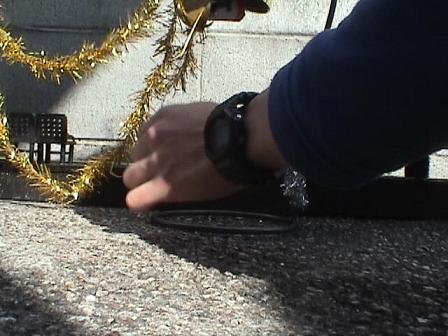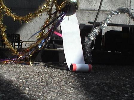 ▲紙が反対だったのです。(「おめでとう」と書いてあるのに) くす玉割りの後一番列車が到着しました。