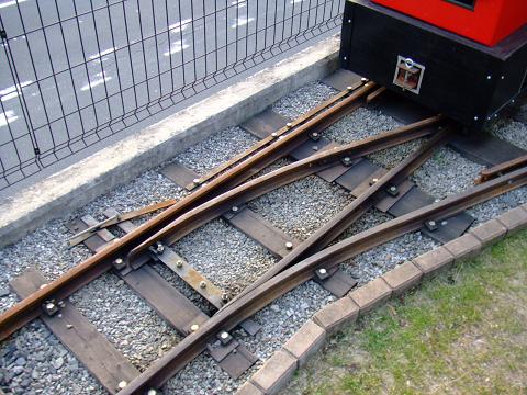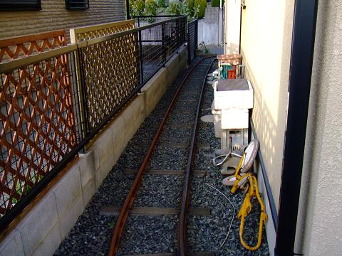 明野軽便鉄道 こちらでは明野軽便鉄道の路線をご紹介します。 (一部不十分ですがご了承ください) ▲ 明野軽便鉄道の路線図です。 走行順路は@→A→B→C→@が基本です。 @ ▲ 明野軽便鉄道のポイントです。 桜谷軽便鉄道のものとは大変異なります。 A ▲ ここがお庭から自動車の隙間を通って玄関にいくところのカーブです。 B ▲ 玄関前です。 線路でけつまづくことがないようにされています。 C ▲勾配を上りながら家との隙間を走っていきます。