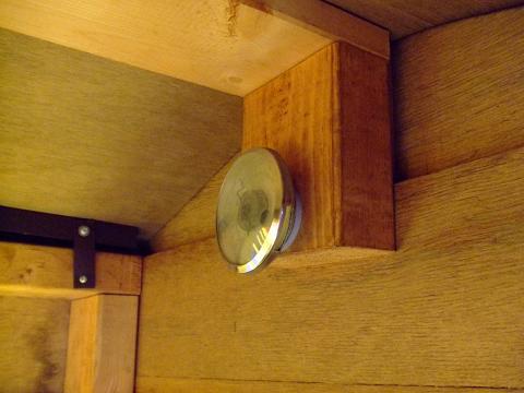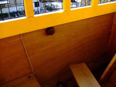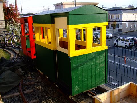 客 車 明野軽便鉄道の客車です。 この車両は三回ほどお色直しされています。 ▲ 客車の外観 製造当初は青と白というカラーでしたが しばらくしてから今の色に変わりました。 ▲ ちゃんと客車に扉があります。 手動で扉は開閉してください。 ▲ 車内には機関車につながるボタンが設置されています。 ▲ 車内に温度計も完備されています。