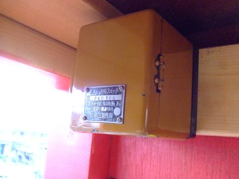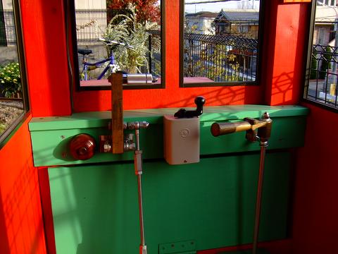 機関車 明野軽便鉄道の主動力です。 ガソリン発電機で電気を起し交流モーターを動かします。 ▲ 機関車の外観です。 ▲ 機関車の運転台です。 左からベル・マスコン・逆転機・ブレーキ ▲ 上部左には機関車と客車についているボタンを押すとベルが鳴る また上部右には成田山不動尊のお守りも ▲ 上部後には「ATS復帰スイッチ」が・・・。(ダミー)