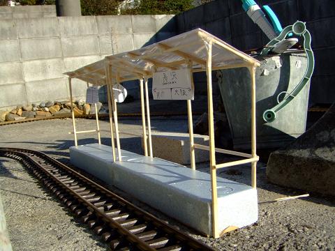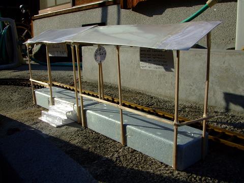 長沢駅増築 当鉄道は旧長沢駅だと客車二号車が停車できないということで駅の増築を行いました。 駅のモデルは田舎のような駅をモデルとし屋根も防水加工が施され頑丈な作りとなりました。 駅名板は旧長沢駅から、時計と時刻表は新しく製作しました。